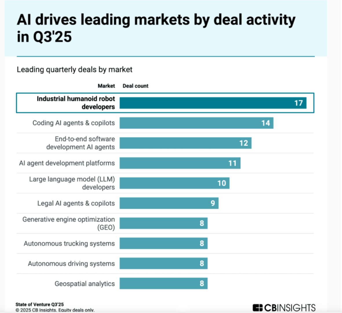 Industrial humanoid robotic developers saw 17 fundraising rounds in Q3, more than any other market and good for a back-to-back quarterly record (with 23 deals in Q2).